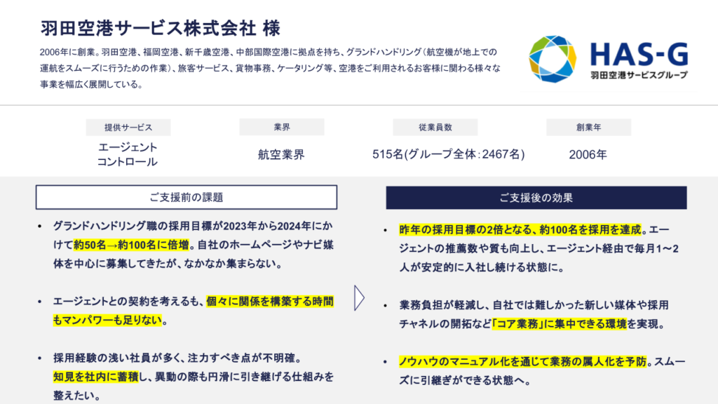 航空機の地上支援業務を担う羽田空港サービス株式会社(東京都大田区)もその一つで、年間100名採用の目標を前に、エージェントを活用して母集団を広げたいと考えていたものの、初めての取り組みとなるため、知見が少なく悩んでいました。