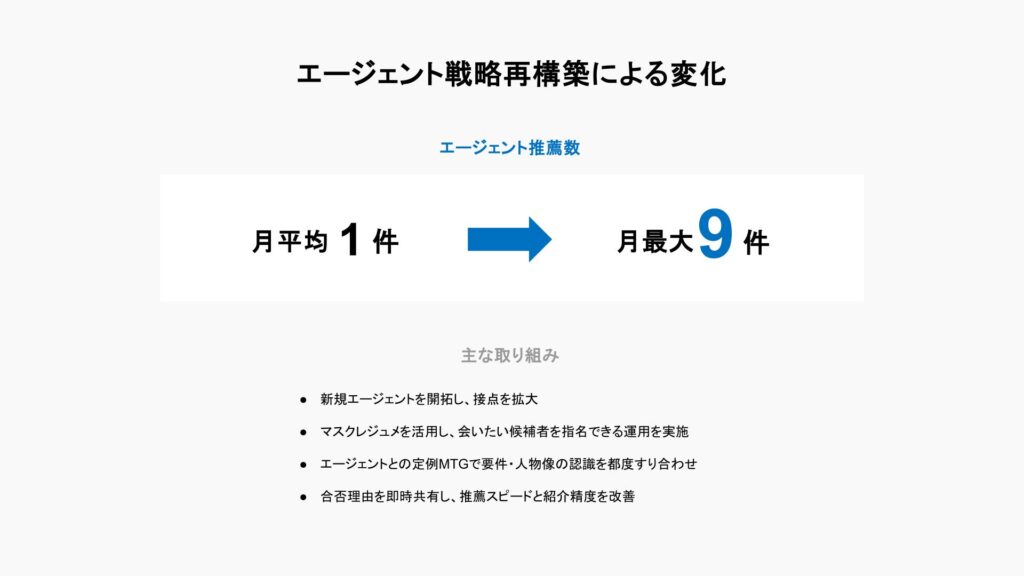 一番驚いたのは、受け身で推薦を待つのではなく、「マスクレジュメ会」のように自ら候補者を探しに行く施策を打ち出し、エージェントに対しても積極的にアクションを起こしてくれる姿勢ですね。