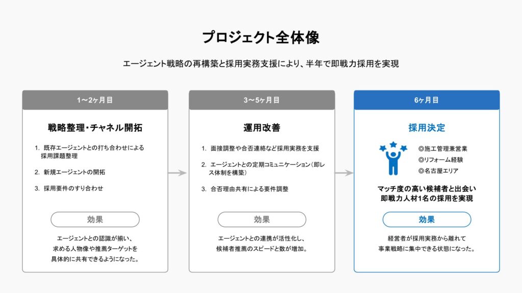 これまでのようにただ求人を出して応募を待つのではなく、アールナイン側から複数の人材紹介会社(エージェント)へ積極的にアプローチし、新規の開拓から契約業務までを担ってくれました。